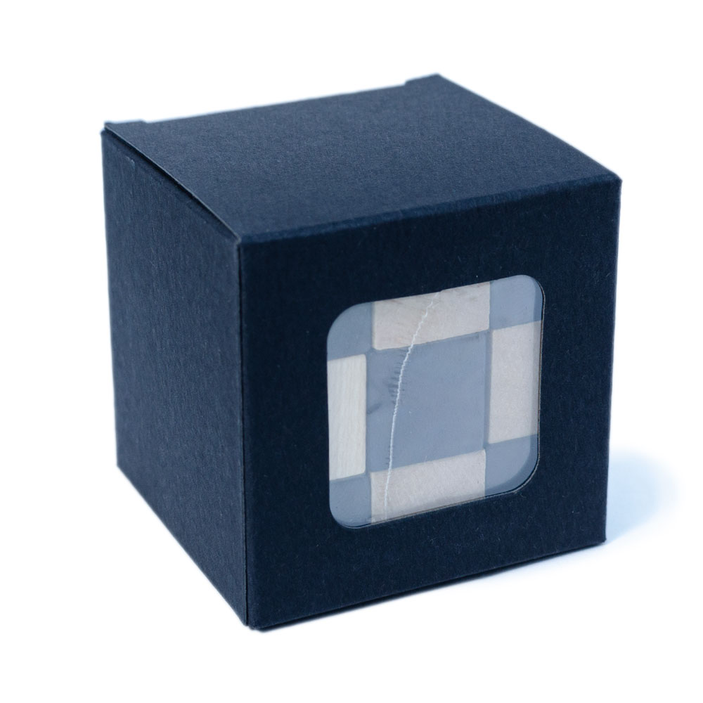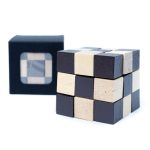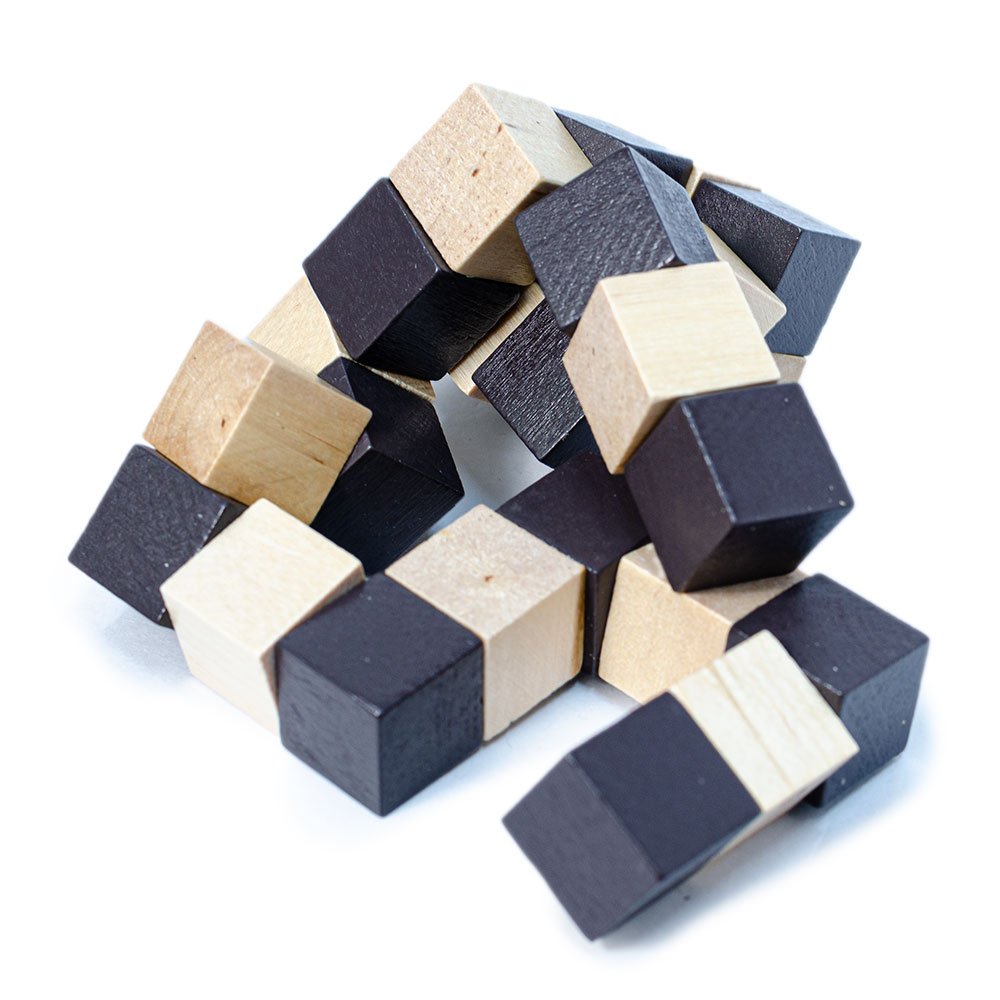 Rompecabezas de madera que consta de una larga tira de piezas cúbicas. El reto en este caso consiste en encontrar la posición correcta de cada bloque de piezas para regresar hasta la forma cúbica original.